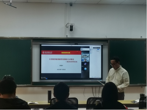 为了提升我院教师教学科研水平,吸收和引进先进的教学理念,促进数学教育的进步和发展,开拓学生视野,2022年11月3日下午,应学院邀请,北京联合大学玄祖兴教授在师范技能实验室线上、线下同步为我院师生分享大学数学教育教学改革的几点做法。英国正版365首页40余名师生在师范技能教室聆听了玄教授的报告。