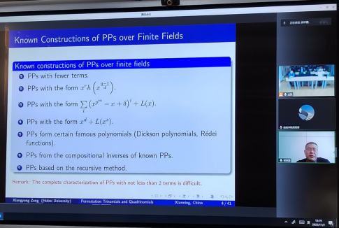 本次报告由金凯博士主持,首先,金老师简单介绍了曾教授。曾教授为湖北大学二级教授、博士生导师,现为中国密码学会理事、湖北省工业与应用数学学会副理事长、湖北国家应用数学中心学术委员会委员、湖北省重要领域国产密码应用专家、湖北省杰青。接着,曾教授为我们介绍有限域上置换三项式和四项式的一些构造方法以及置换多项式在密码学中的应用。