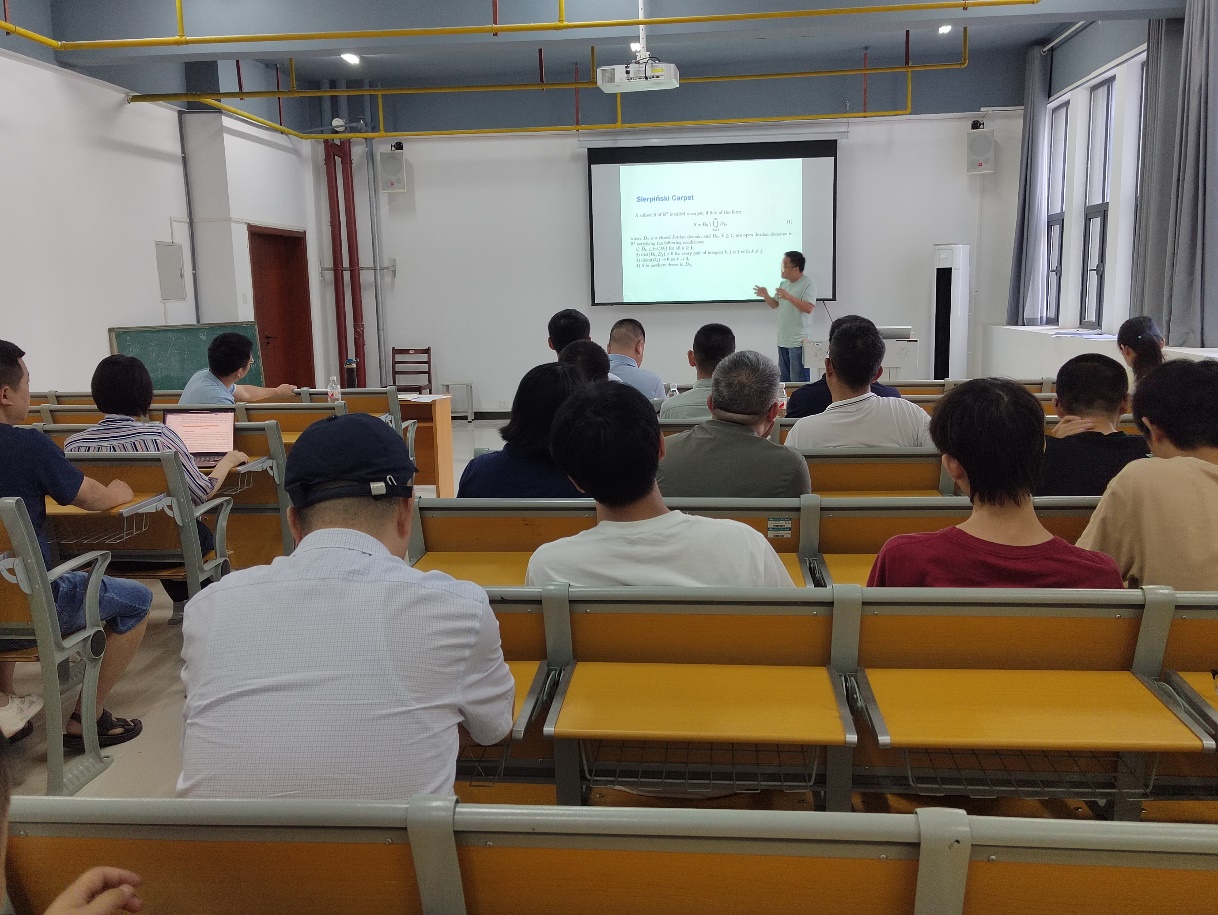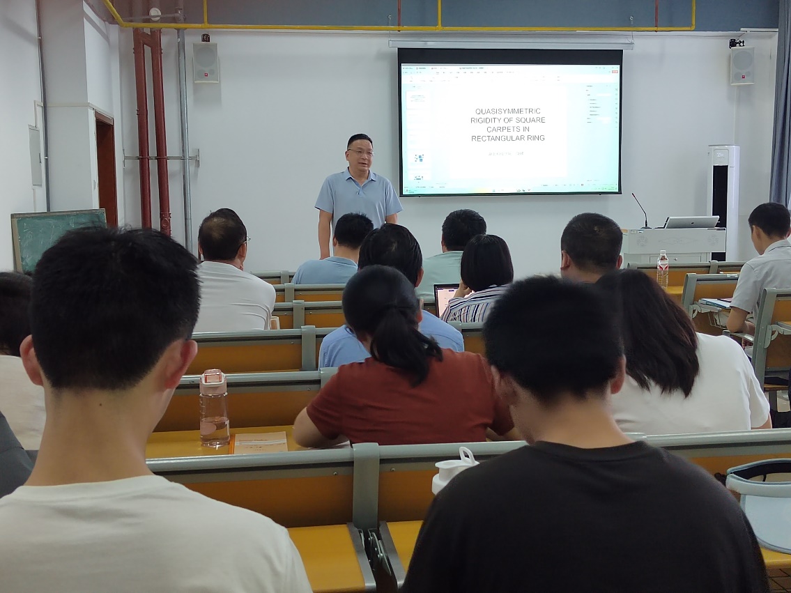 活动伊始,数统学院饶峰老师率先登场,带来了一场题为“矩形环中正方形地毯的拟对称刚性”的主题报告。饶峰老师凭借深厚的专业知识和丰富的实践经验,深入浅出地阐述了矩形环中正方形地毯拟对称刚性的相关理论与研究进展。他通过生动的案例和严谨的推理,将复杂的学术概念变得通俗易懂,让在场师生对这一前沿领域有了更为清晰的认识。报告结束后,大家针对感兴趣的问题进行了深入的交流和讨论。
