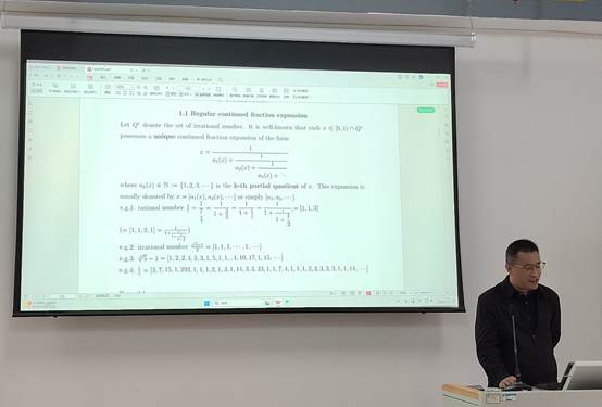 桂咏新教授以《正则连分数展开中部分商频率的大偏差谱》为题,提出"部分商频率的大偏差谱"概念,并通过严谨的数学推导证明其与精细多重分形谱的等价性。研究团队成功构建出大偏差谱的显式表达式,为分析正则连分数展开中发散点的分形特征提供了全新理论工具。该成果在数论与分形几何交叉领域具有重要学术价值,现场师生就谱函数的构造方法与数学意义展开深入讨论。