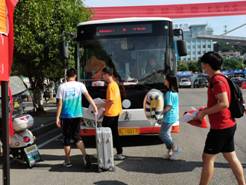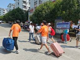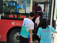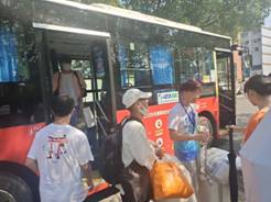 在学校正门迎来新生同学们后,志愿者带领他们坐上开往宿舍方向的摆渡车,虽然有些新生的行李很多,但志愿者们都会帮忙搬运,虽然天气炎热,小萌新的心里也是甜的。