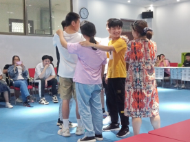 最后一个游戏是“相互夸赞”。余老师让一组同学绕成一圈,夸赞站在自己前面的人。余老师表示,当面夸赞他人是很困难的,但是当他人夸赞我们时,我们的心跳会加速,对夸赞人的好感度也会上升。这其实也告诉了我们,当我们的同伴,我们的团体取得成就时,我们应该给予鼓励,并且为他们的成就点赞。