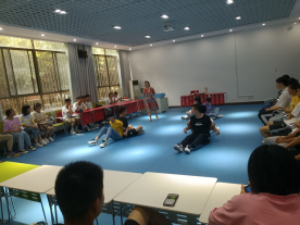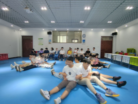 第一个游戏叫“背背佳”。先是两个人一组,背靠着背,手挽着手,坐在地上,而后两人相互配合同时站起来。然后逐渐增加人数,游戏的难度也随之增加。余老师让最先站起来的小干事们传授经验,他们说,“我们一起用脚后跟发力,就站起来了”、“我们让女生站在男生中间,让男生带着女生站起来”… 最后余老师总结说,这个游戏既需要一个领导人物,指挥大家动作统一、一起使力,也需要整个团队的配合,共同完成。
