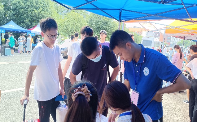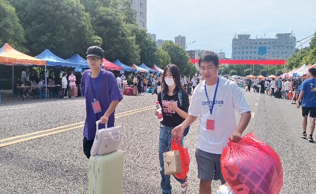 在确认了所对接的新生到校时间后,志愿者们扛起了大包小包,引领他们乘上摆渡车。骄阳似火,人心炙热,志愿者们用行动表现了他们对