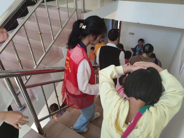 紧接着志愿者带领小朋友们开展了地震室外疏散演练,紧急的警报声在耳边回荡,志愿者指引着小朋友们排成队,有条不紊地依次排序往室外跑,演练全程,小朋友们都十分有序,抱住最紧要的头部,弯下身向室外跑去。