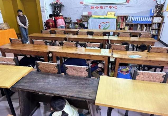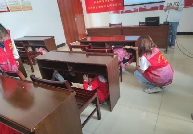 宣讲结束后,志愿者们便展开了现场地震演练,以助于让社区小朋友们更真切地感受到情景发生时的紧迫。志愿者们先对地震时的动作要领进行讲解和演示,接着便开始了正式的地震演练,演练首先在室内进行紧急避险演练,警铃刚一响,小朋友们便随着志愿者的指示迅速躲藏在了桌子下方,谨遵“蹲下,藏身和抓牢”三要素。