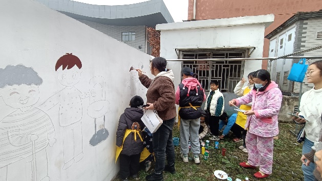 墙上的图案吸引到了社区的小朋友们,他们积极地拿起画笔,同画手们一起填充上自己喜爱的颜色,感受画画的快乐,通过墙面上的字和图案的解析,逐渐意识到“做到孝道、弘扬孝道、传承孝道”的重要性和意义。