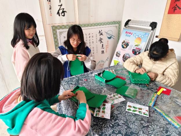 (志愿者带领小朋友们制作小红军包包)