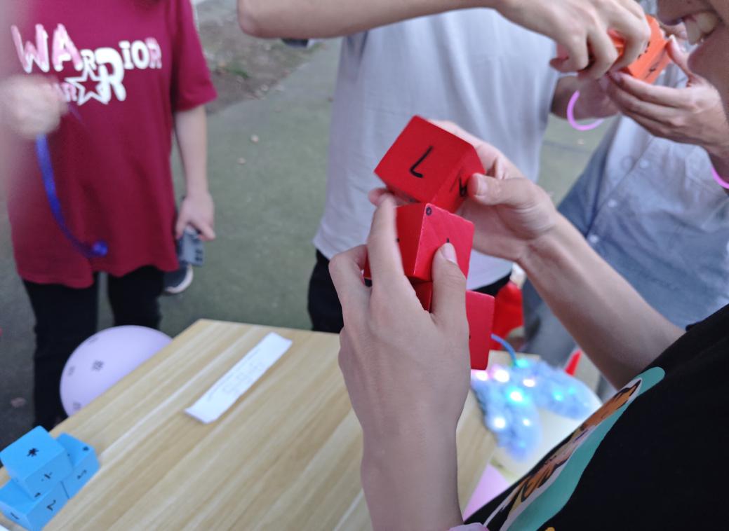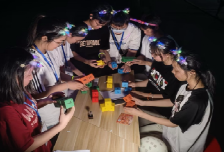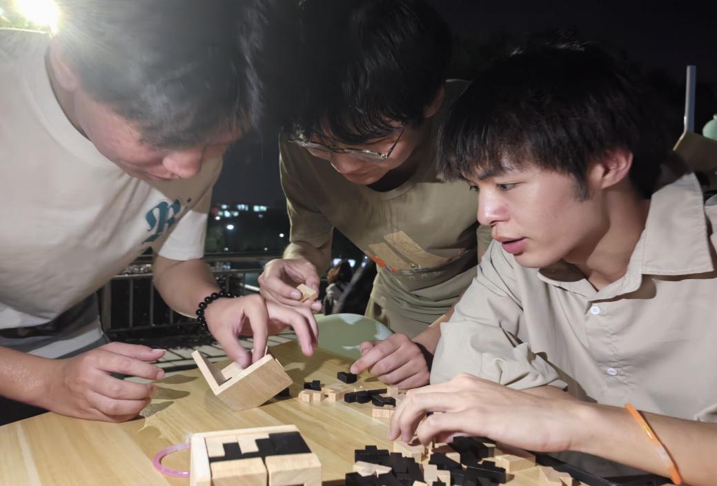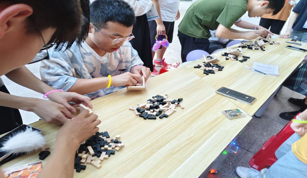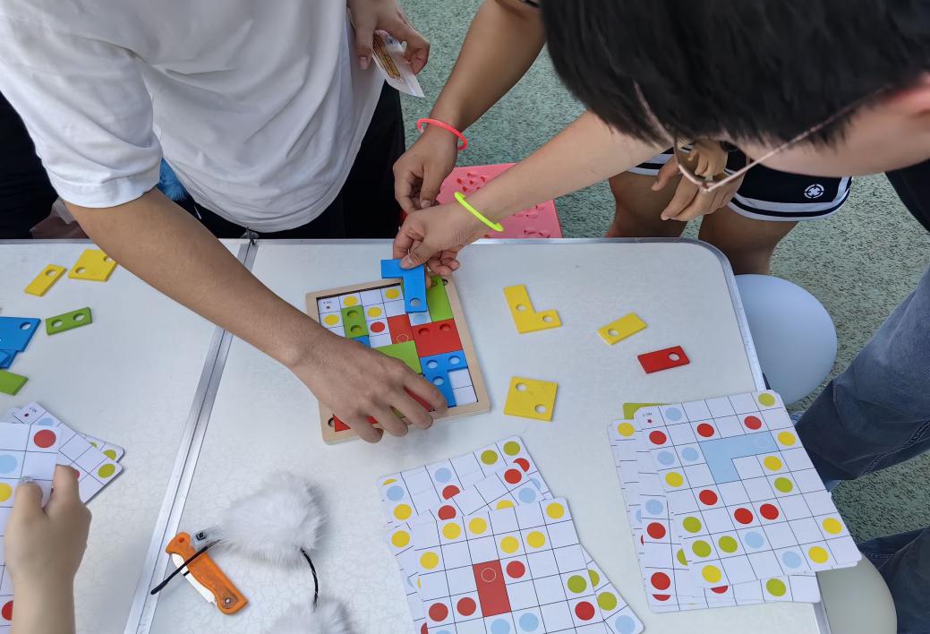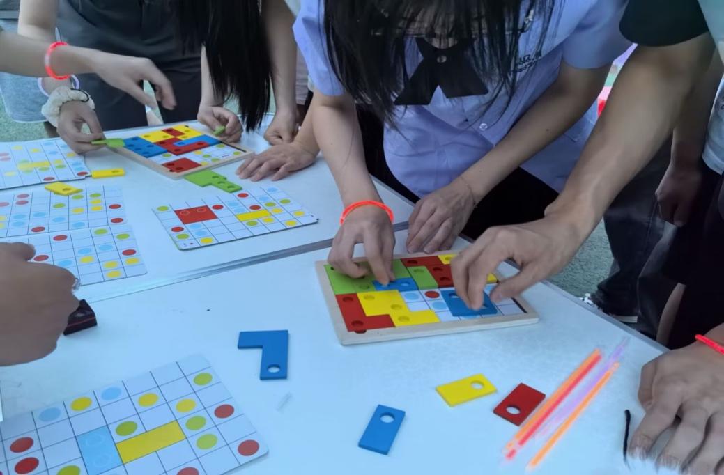 本次活动共设有四个游戏点,分别是位于学校南门的方块算式、理工二栋楼下的魔斗54T/L、西区操场的方块拼图以及揽胜楼下的智胜飞行棋。每个游戏都独具特色,在规定的时间内完成游戏,方块算式是将9个正方体按不同颜色分为三组,搭成一个四棱柱使运算结果相同;魔斗54T/L是将54个小T或L拼成一个完整的正方体;方块拼图是将4种颜色4种形状共16块拼图覆盖方格纸上不同颜色的小圆点并填满;智胜飞行棋是由一位玩家代表队伍在由指压板拼成的棋盘中进行游戏,其余队员在指压板旁答题。