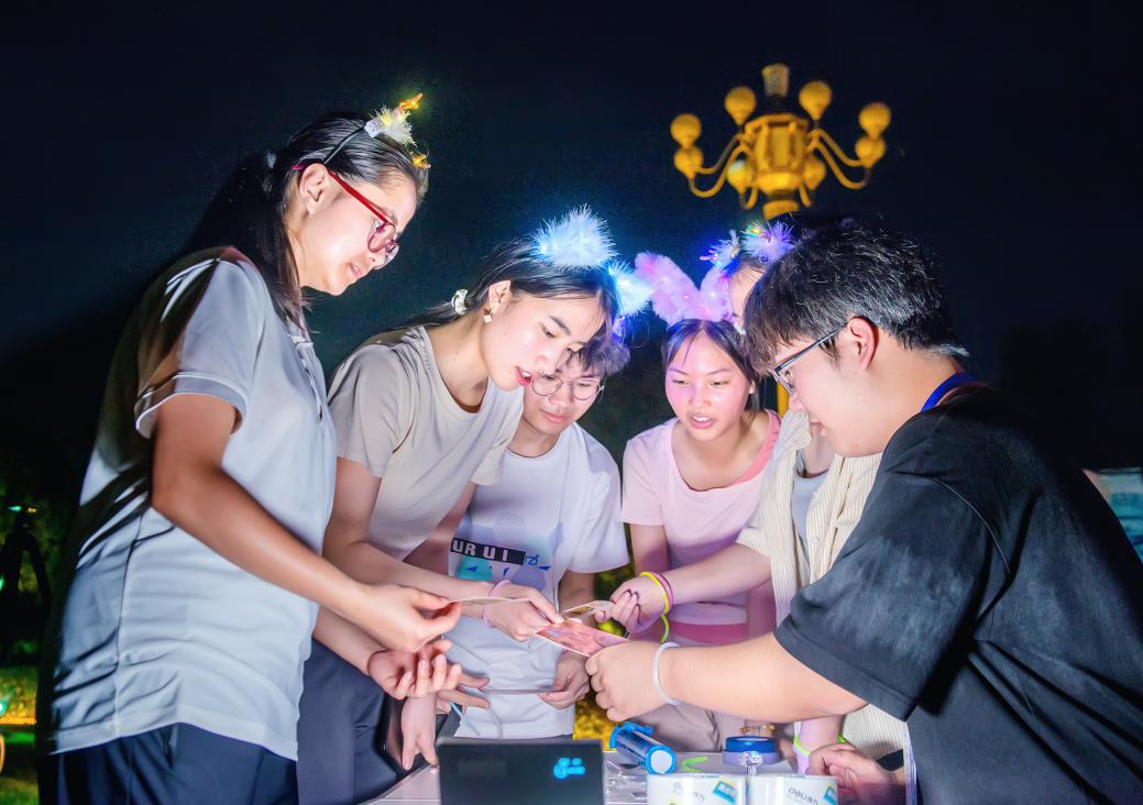 夜幕降临,同学们佩戴着荧光手环和荧光头饰从揽月广场出发,奔向不同的游戏点位,抢占先机。揽月大道上,一片荧光闪烁,五颜六色的荧光点亮校园,同学们到达游戏点后,对游戏展开激烈的讨论,用理性的目光分析游戏,沉着应战,凭借着自身过硬的计算能力和严谨的逻辑思维、灵敏的反应能力,快速完成游戏任务,共同奔向终点。