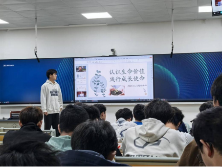 班会伊始,班委围绕活动主题阐明了生命教育的重要意义,强调树立正确生命观、价值观对大学生成长发展的关键作用,拉开了班会的序幕。通过PPT讲解、短视频展播、典型案例分享等形式,围绕“生命中最有价值的瞬间”“有限生命如何创造无限意义”等话题,引导学生从“自我—他人—社会”三个维度,深入理解生命的联结与责任,增强对生命价值的理性认知。