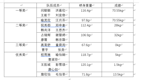 在评审环节,最激动人心的莫过于纸桥模型的承重加载,只见选手们小心翼翼地将一个个承重物放到纸桥上,每一次的摆放、每一次的犹豫与停顿都令人心弦一紧。经过激烈的角逐和严格的评审,最终闫聪聪、洪嘉欣、王能干、刘宜昚和喻灵欣、汪月芬两组选手制作的纸桥均承载了超70.55千克的荷载,荣获本届大赛一等奖!