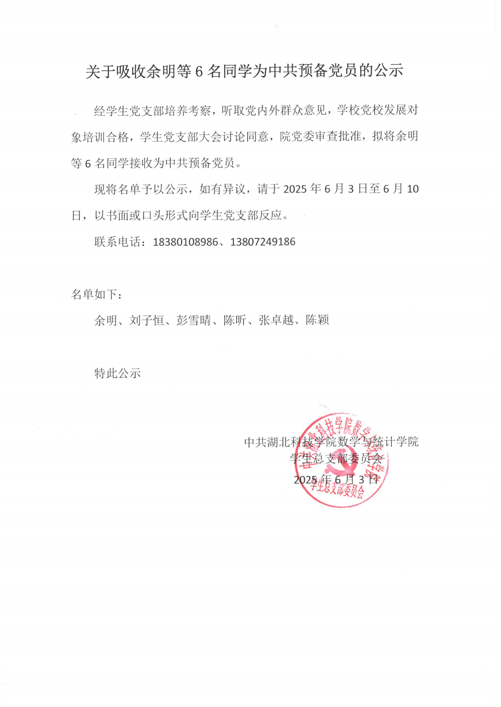 关于吸收余明等6名同学为中共预备党员的公示