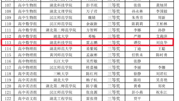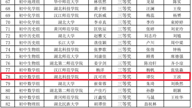 2023年10月10日,第十二届湖北省普通高校师范专业大学生教学技能竞赛初赛公示,我院2020级数学与应用数学2班雷志鹏同学获高中数学组三等奖,2020级数学与应用数学1班沈可欣同学获初中数学组三等奖。